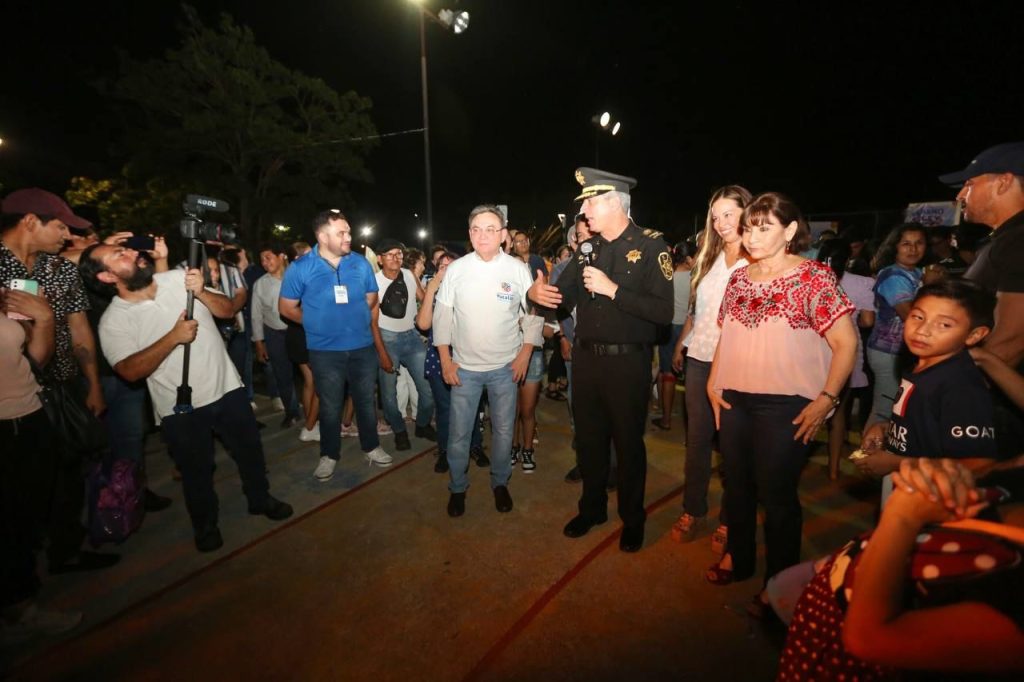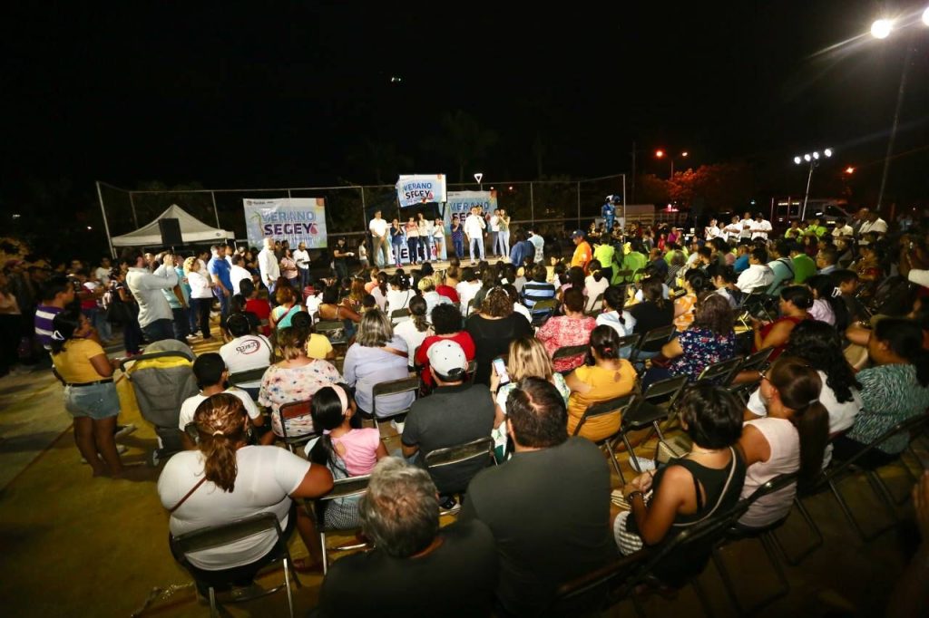 Hoy estamos haciendo comunidad con la cultura, con el arte, con el tema ambiental, con los servicios del registro civil, con la policía, como el gran equipo que somos, para dar el banderazo oficial de Verano Segey, que nos ha instruido el gobernador Mauricio Vila, ponerle todo nuestro esfuerzo para beneficio de cada niña, niño y sus familias, dijo ante vecinos que se dieron cita en el parque Flamboyanes del Fracc. Juan Pablo II.