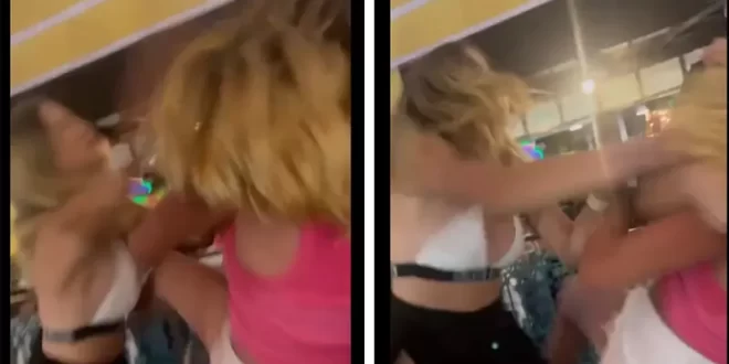 La chica de rosa intenta levantar la pierna para defenderse, pero es neutralizada de inmediato por Marianne, quien continúa golpeándola repetidamente en la cabeza. La escena ocurre ante la mirada atónita de varias personas en el lugar.