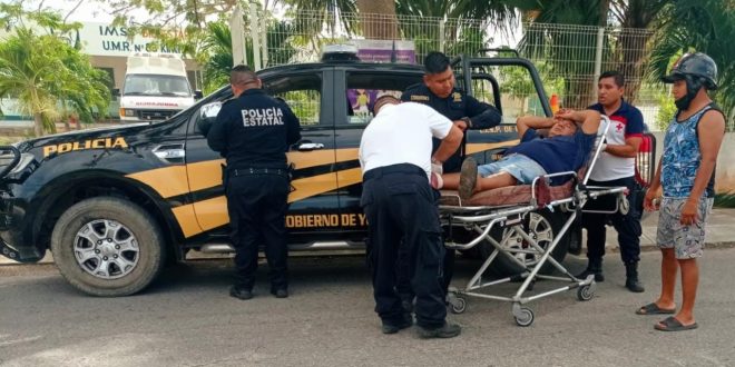 Posteriormente los paramédicos de la Cruz Roja (Yuc-010), que minutos antes habían atendido a una sexagenaria kinchileña que sufrió un azotón en el interior de su domiciclio de la calle 23 con 20 y 22, se encargaron de brindarle apoyo. Finalmente la ambulancia de traslado local abordo al señor herido y lo llevó al Hospital H’Orán en Mérida para una mejor atención médica.
