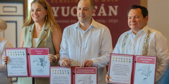 La alcaldesa signó el convenio junto con el subsecretario de la Secretaría de Desarrollo Agrario, Territorial y Urbano (SEDATU), Víctor Hoffman Aguirre; el gobernador de Yucatán, Joaquín Díaz Mena; el director del Instituto de Movilidad y Desarrollo Urbano Territorial (IMDUT), Irak Greene Marrufo y los representantes de los 14 municipios que integran la zona.