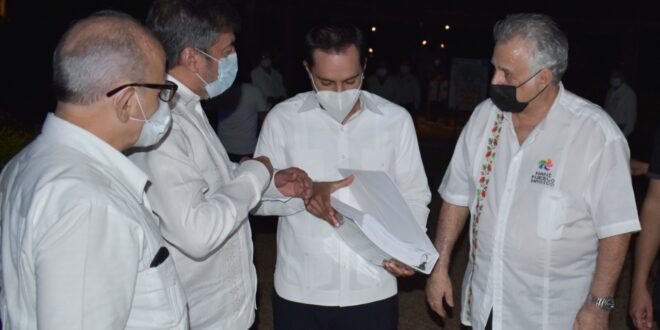 Uxmal, Yucatán a 02 de junio de 2021.- Con el objetivo de promover y consolidar el desarrollo del turismo sustentable en la Ruta Puuc, mediante la propuesta de acciones, estrategias e inversiones en materia turística, ambiental y urbana, el Fondo Nacional de Fomento al Turismo (Fonatur) de manos de su director general, Rogelio Jimenez Pons, hizo entrega del Programa Regional de Desarrollo Turístico de la Ruta Puuc, al Gobernador del Estado de Yucatán, Mauricio Vila Dosal.