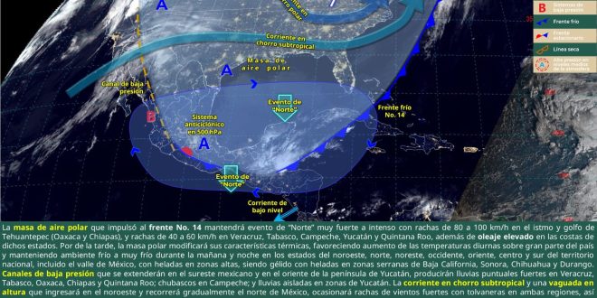 Se prevé cielo parcialmente nublado a nublado, con probabilidad de lluvias ligeras en Yucatán, Campeche y Quintana Roo debido al frente frío número 14 extendido sobre el mar Caribe occidental. La masa de aire polar asociada favorecerá un ambiente cálido durante el día y fresco a cálido durante la noche, así como vientos del norte noreste, de 15 a 25 km/h en Yucatán y Campeche (sin descartar rachas mayores a 40 km/h en la costa) y de 30 a 40 km/h en Quintana Roo (sin descartar rachas mayores a 50 km/h en el litoral ).