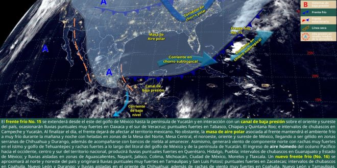 El frente núm. 15 se desplazará sobre la península de Yucatán, la humedad asociada a este provocará chubascos en el noreste y oriente de Yucatán, sur de