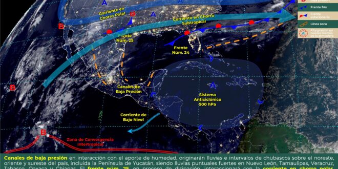 Se prevé que durante este día, el frente No. 24 se mantendrá con características de estacionario y en proceso de disipación sobre el noreste de la península de Yucatán, por lo que se presentarán las condiciones de cielo medio nublado a nublado, con probabilidad para chubascos dispersos en sectores del oriente, sur y noroeste de Yucatán, centro y sur de Campeche, mientras que en el norte de Quintana Roo se esperan intervalos de chubascos con lluvias localmente fuertes. Las temperaturas serán cálidas durante el día y frescas a templadas por la noche, con vientos del norte-noreste de 15 a 25 km/h y rachas mayores a 40 km/h en la sonda de Campeche.