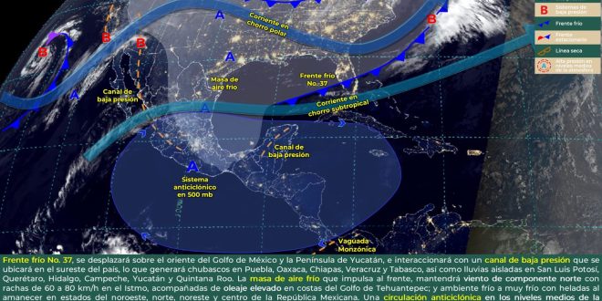 Se prevé que debido al ingreso del frente frío No.37 se presenten condiciones de cielo parcialmente nublado a medio nublado, con probabilidad de lloviznas