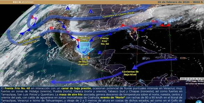 El frente frío No. 40 ingresará en el transcurso del mediodía en el occidente de la península de Yucatán, favoreciendo aumento de nublados con probabilidad para intervalos de chubascos en el noroeste, norte y centro de Yucatán, norte y sur de Campeche así como en el centro y norte de Quintana Roo.