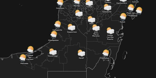De acuerdo con el pronóstico meteorológico, en las próximas 24 horas se prevé cielo parcialmente nublado a nublado, con lluvias fuertes a puntuales muy fuertes en Campeche y Quintana Roo, mientras que en Yucatán se esperan chubascos, sin descartar lluvias puntuales fuertes.