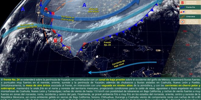 El frente frío No. 24 al norte de la península de Yucatán y la masa de aire frío que lo impulsa, generarán en la península de Yucatán condiciones de cielo parcialmente nublado con probabilidad de chubascos en el norte, centro y sur de Quintana Roo, oriente y noreste de Yucatán, oriente, centro y sur de Campeche, asi como intervalos de lloviznas en el resto de la región. Viento del norte-noreste de 15 a 25 km/h y rachas mayores a 45 km/h en zonas de costa. Ambiente cálido en el día y templado a cálido en la noche.