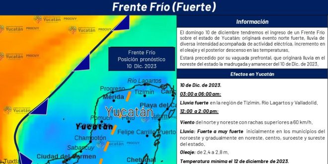 Mérida, Yucatán, a 8 de diciembre de 2023. La Coordinación Estatal de Protección Civil (Procivy), informa sobre un nuevo Frente Frío que ingresará el próximo domingo 10 de diciembre, el cual traerá viento, lluvia y oleaje fuerte al territorio yucateco, así como posterior a su paso, descenso en las temperaturas.