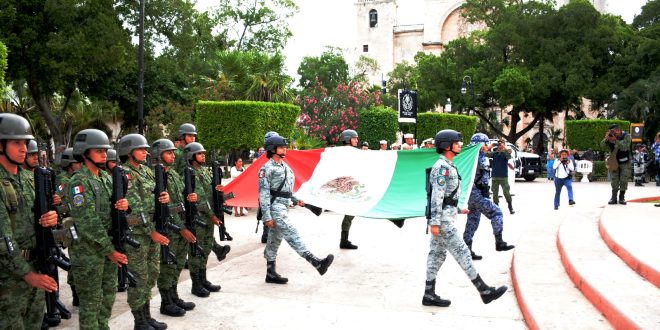 Se realiza en la Plaza Grande del Centro Histórico de Mérida el Izamiento de Bandera en una ceremonia cívica con la presencia de autoridades militares y civiles de los tres niveles de gobierno