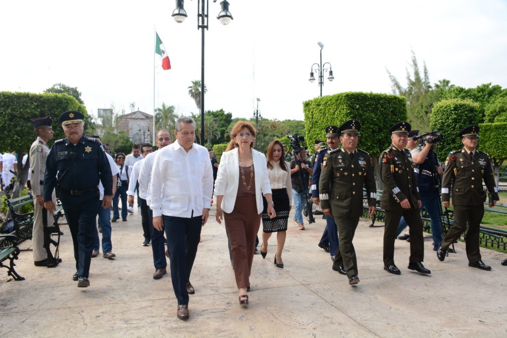 Minutos antes de las 8:00 horas, la titular de la SGG salió caminando del Palacio de Gobierno, junto con el comandante de la X Región Militar, General de División, Homero Mendoza Ruiz; de los representantes de los Poderes Legislativo y Judicial, y el alcalde de esta ciudad, Alejandro Ruz Castro, y se trasladó hasta el centro de la Plaza Grande del Centro Histórico de esta capital.