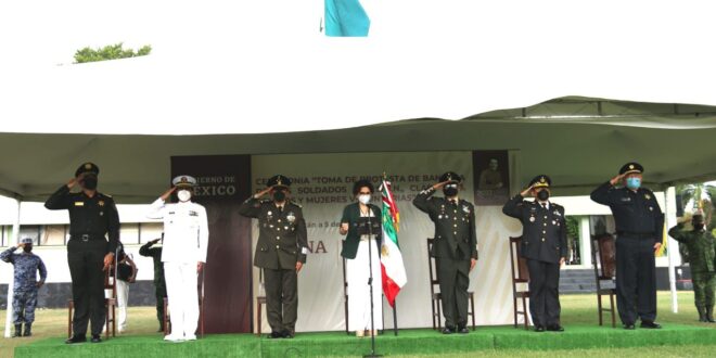 – En el marco del acto cívico, la titular de la SGG realiza también la toma de protesta de bandera a integrantes del Servicio Militar Nacional Clase 2003