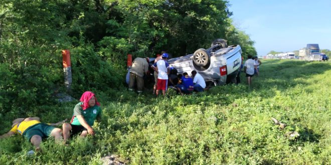 Como estaba cerca el retén policiaco rápidamente elementos destacados en el lugar corrieron auxiliar a los lesionados que empezaban a salir de la camioneta volcada por sus propios pies.