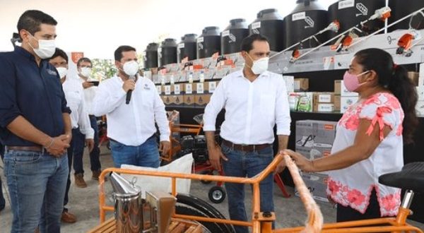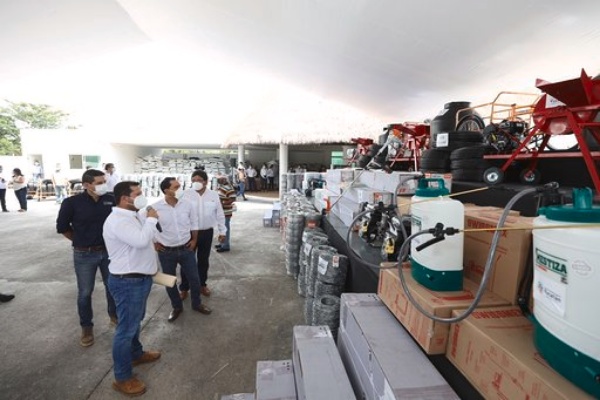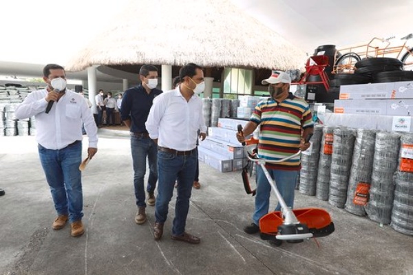 -En gira de trabajo por el municipio de Tekax, el Gobernador Mauricio Vila Dosal puso en marcha la distribución de herramientas, maquinaria y materiales de dicho esquema, que este año beneficia a 13,846 productores de todo el estado con una inversión de más de 103 millones de pesos.
