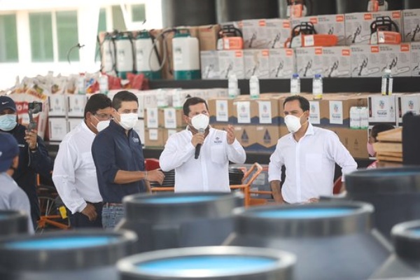 Acompañado del titular de la Secretaría de Desarrollo Rural (Seder), Jorge Díaz Loeza y del alcalde de Tekax, Diego Ávila Romero, el Gobernador supervisó en la Casa de Artesanías de esta ciudad las herramientas, equipos y materiales que se comenzaron a suministrar, bajos los protocolos y medidas sanitarias, a los productores de esta zona y que, de manera paulatina, llegarán a todos los municipios del estado.