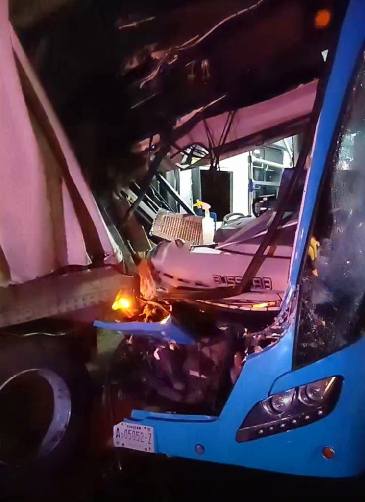 El camión de la empresa “Va y Ven” de ADO, se estrelló en la parte posterior de un tráiler en la citada carretera, a la altura de Xcanatún.