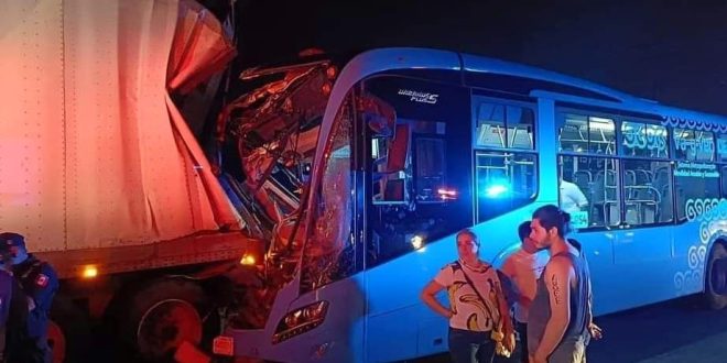 Mérida, Yuc., a 15 de mayo 2024.- Una Unidad de transporte “Va y Ven” colisionó contra un tráiler, dejando 11 heridos entre ellos un agente de la SSP Yucatán en la carretera Mérida- Progreso.