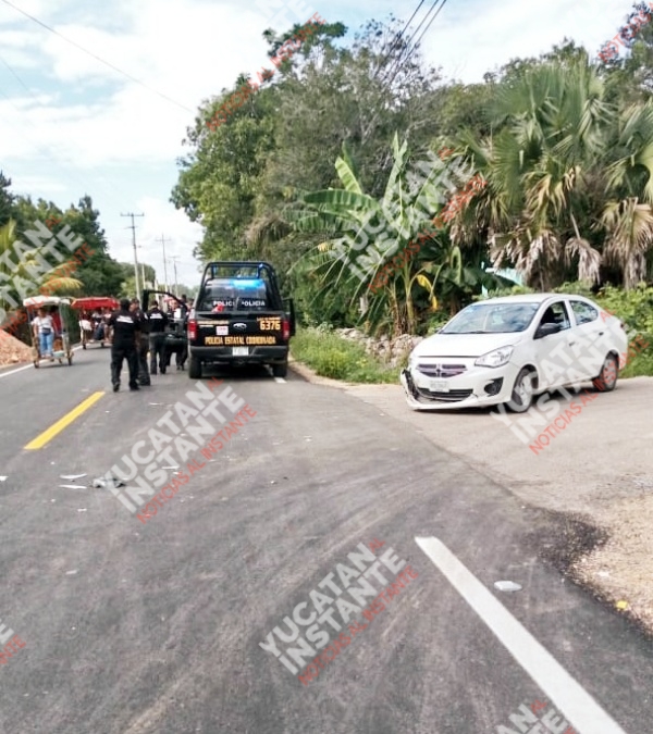 Lucía Anel, vecina de Morelos, Q. Roo transitaba de Oriente a Poniente sobre la calle 2, de dicha comunidad, cuando no respetó el alto de disco y se proyectó del costado de un automóvil Tsuru habilitado como taxi, donde transportaba a una mujer pasajera. El compacto Nissan con matrícula ZCL-319B, era guiado por don Gilberto C.P., de 65 años y marchaba con preferencia sobre la 17 de Sur a Norte. Paramédicos de la unidad Y-3 de la SSP, trasladaron a la fémina policontundida al IMSS de Maxcanú.