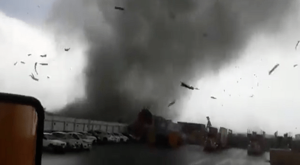Se trata de un tornado, grande y de color negro, que a su paso arrasó, entre otras cosas, con techos de lámina. Además, arrojó escombros por donde avanzaba.