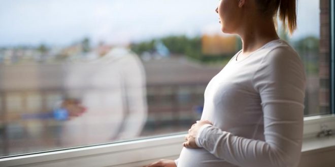 Thoughtful pregnant woman looks out the window home. Holding a hand on the tummy. Mental health and pregnancy.