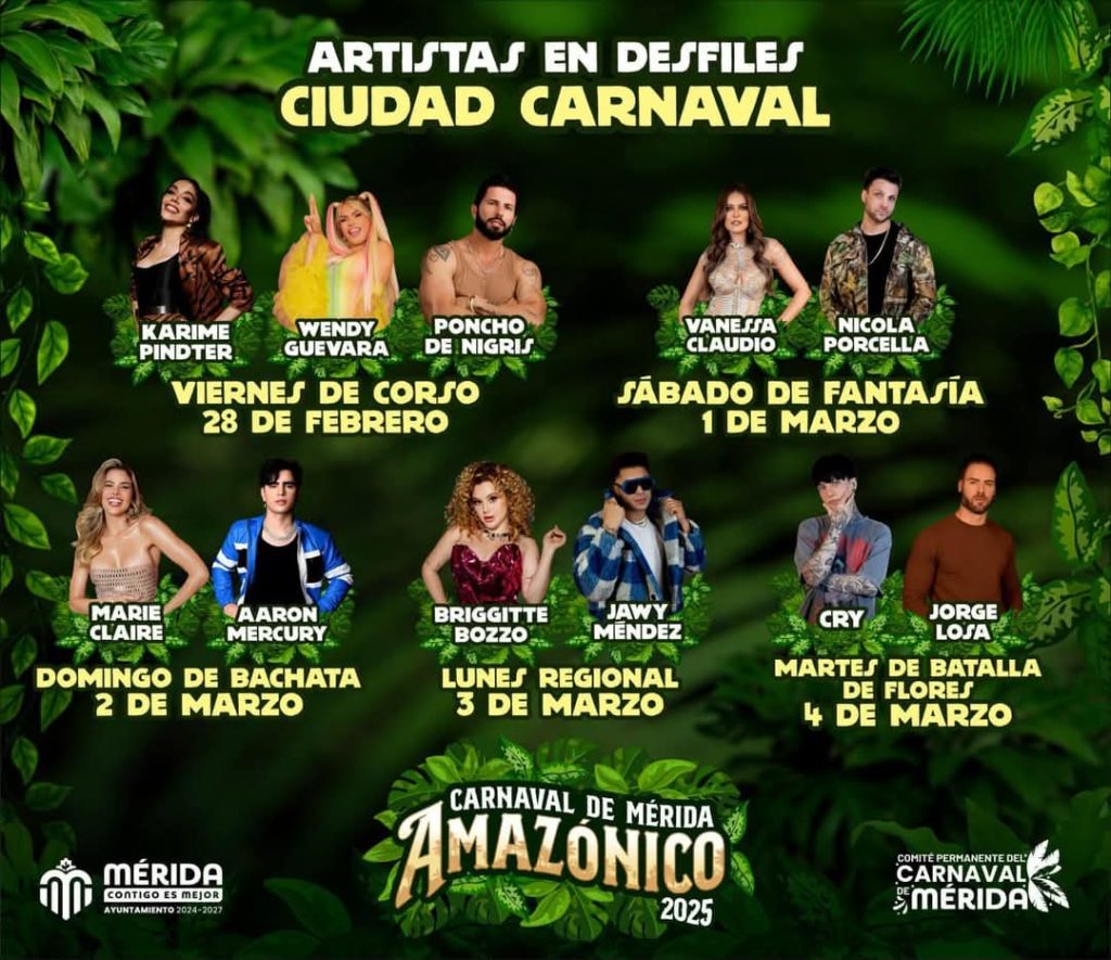 La inauguración oficial en Ciudad Carnaval (Recinto Ferial Xmatkuil) se realizará el viernes 28 de febrero a las 8:00 pm y, al terminar, iniciará el Desfile de Corso en el que los influencers Karime Pindter, Wendy Guevara y Poncho de Nigris pondrán la diversión. En el Centro de Espectáculos Montejo se presentará a las 11:00 pm la agrupación juvenil colombiana Piso 21.
