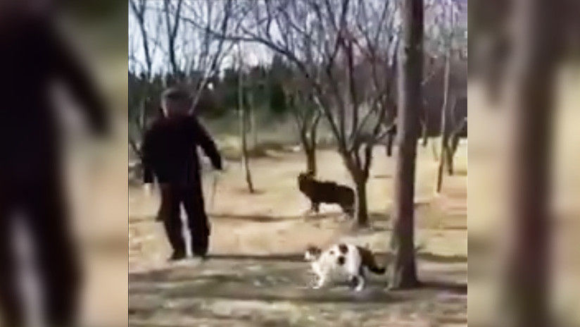 A primera instancia, el adulto trata de alejar a los felinos que ya se encuentran asechando a sus víctimas a la distancia; sin embargo, éstos comienzan a acercarse poco a poco hasta que atacan sorpresivamente a la mascota del ciudadano chino.
