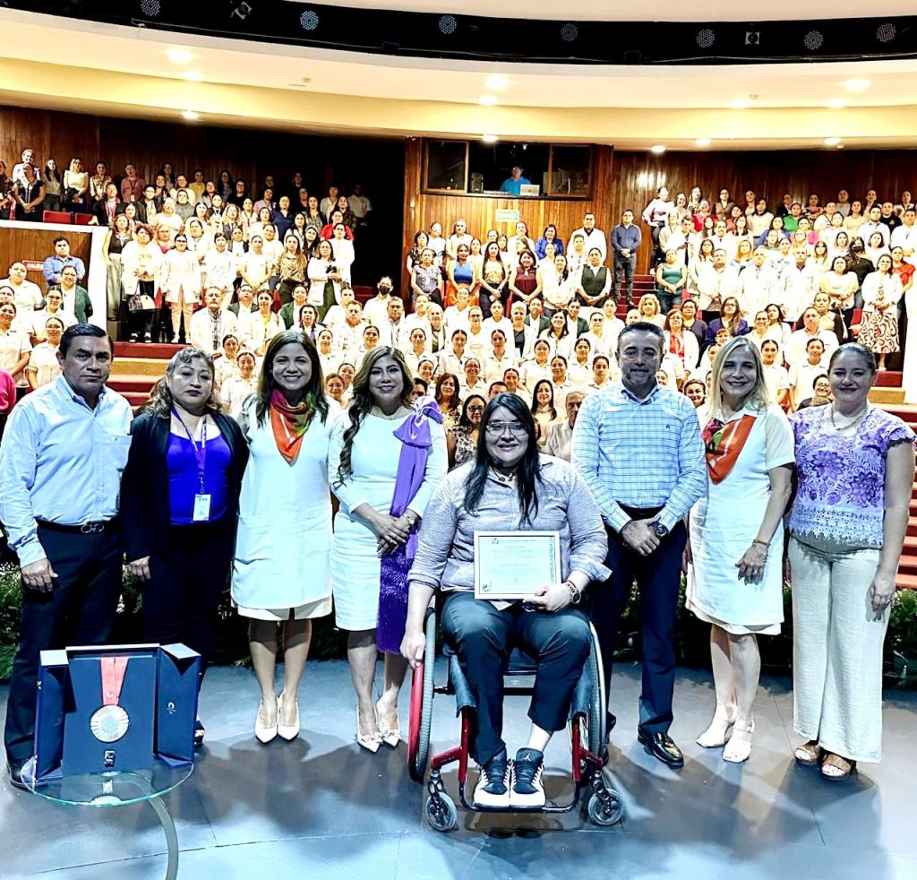 Entre aplausos, la deportista paralímpica se apoderó del escenario del teatro del Seguro Social “Dr. Joaquín Jiménez Trava”, para narrar cómo la vida le cambió a partir del 2020, cuando en plena pandemia de COVID-19, a sus 30 años de edad y con una carrera destacada en Criminalística, recibió el diagnóstico de Esclerosis múltiple, por parte de médicos del IMSS, una enfermedad progresiva y degenerativa que derivó en diversas discapacidades motrices.