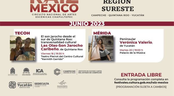 Luego, a las 19:30, ahí mismo, el grupo campechano Las Olas- Son Jarocho Caribeño realizará El son jarocho desde el sur de Quintana Roo: transversalidad cultural; en el Palacio de la Música, Verónica Valerio estará con Peninsular el 20 de junio a las 19:00 horas, y el 24 a las 19:00, Wayaneen llevará Wayaneen paax, reggae, moots, se presentará en el barrio de Guadalupe, en Umán.