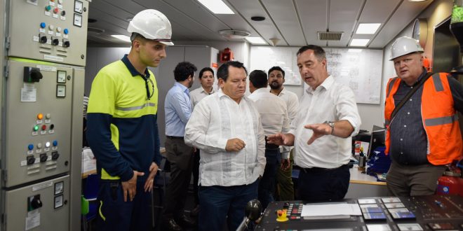 También observó el funcionamiento de las cortadoras que remueven roca del fondo marino, los talleres de mantenimiento, el cuarto de bombeo con sus potentes sistemas de traslado de material y el centro de control, desde donde se operan los tres motores principales que en conjunto alcanzan una potencia de 23,000 kilovatios.