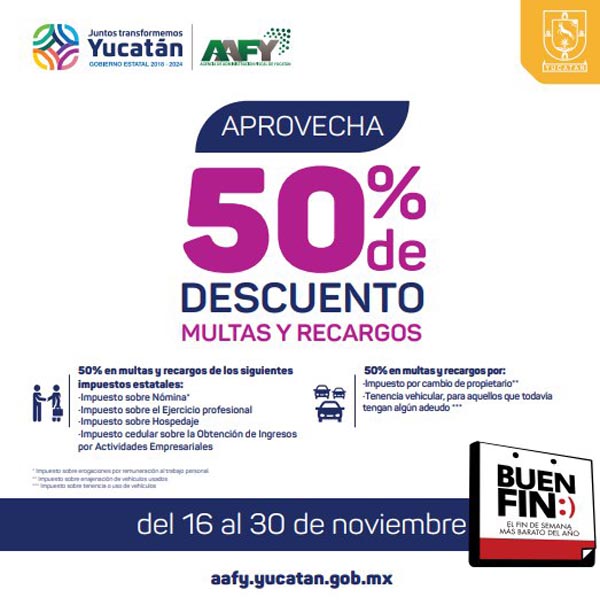 La Agencia de Administración Fiscal de Yucatán (AAFY) también se une a El Buen Fin y extenderá sus beneficios hasta el 30 de noviembre, brindando un descuento de 50 por ciento en multas y recargos derivados de impuestos locales, así como de faltas administrativas.