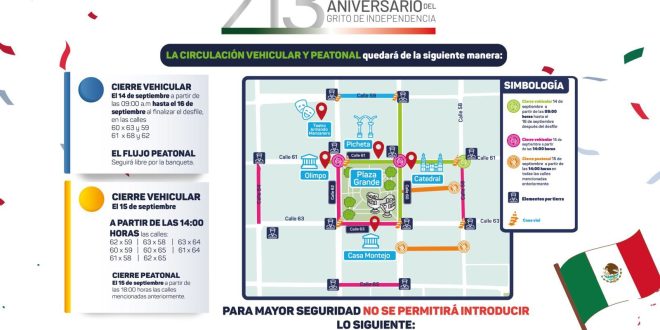 De acuerdo con lo programado, la restricción al tránsito de vehículos iniciará el jueves 14 de septiembre a partir de las 9 de la mañana hasta el 16 de septiembre al finalizar el desfile en las calles 60 con 63 y 59, así como 61 entre 68 y 62, por lo que se dispondrá de vías alternas. El flujo peatonal será libre en estas calles, pero en las banquetas. Asimismo, el 15 de septiembre habrá cierre vehicular y peatonal a partir de las 6 de la tarde en las calles 62 x 59, 60 x 59, 61 x 58, 63 x 58, 60 x 65, 62 x 65, 63 x 64, 61 x 64. La movilidad regresará a la normalidad el 16 de septiembre terminando el desfile.