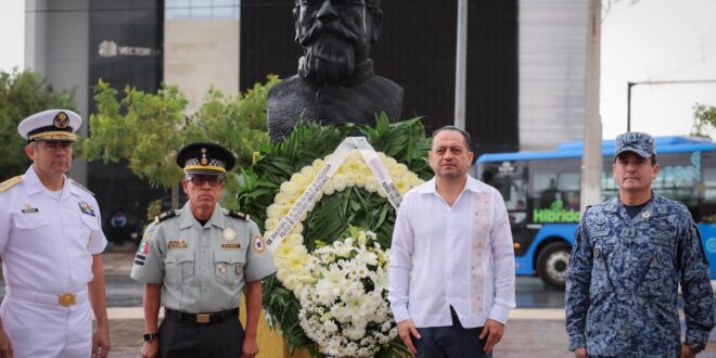 _En representación del Gobernador Joaquín Díaz Mena, el secretario General de Gobierno, Omar Pérez Avilés, encabezó una guardia de honor y ofrenda floral en el busto de Venustiano Carranza, acompañado de autoridades civiles y militares._