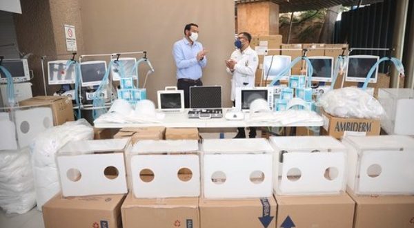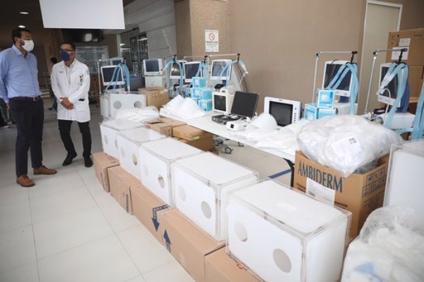 -Se entregaron 20 ventiladores, 20 monitores de signos vitales, 1 videolaringoscopio, 1 camilla cubierta para transferencias hospitalarias, 1 cámara media de transporte con filtro HEPA para personas con sobrepeso, 20 cajas antiaerosol y 50 circuitos de ventilación para la UMAE del IMSS del gobierno federal