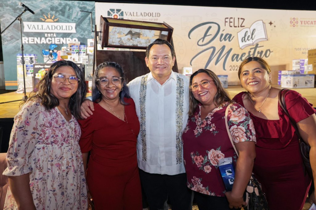 Junto al alcalde vallisoletano, Homero Novelo Burgos, el Gobernador felicitó a los maestros del interior del estado, quienes —dijo— han servido desde escuelas en las comunidades, siempre trabajando como gestores para una mejor infraestructura de sus escuelas, así como para obras que dejen un beneficio a sus comunidades.