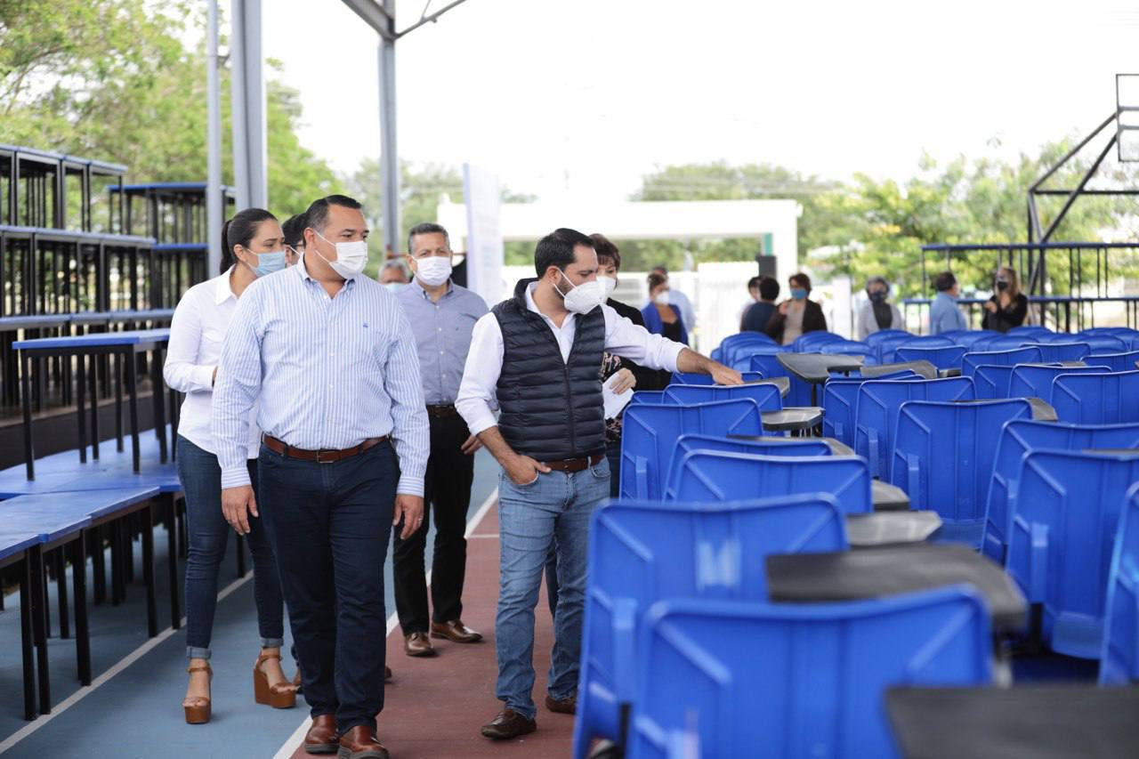 En presencia de directores de esos colegios y acompañado del titular de la Secretaría de Educación del estado (Segey), Loreto Villanueva Trujillo, el Gobernador resaltó la importancia de acondicionar los salones para que, cuando las condiciones sanitarias lo permitan, los alumnos puedan regresar a tomar clases presenciales en un ambiente de aprendizaje adecuado.
