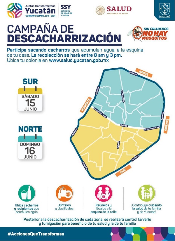 La jornada, en la cual se recolectarán recipientes y cacharros que acumulen agua, como botellas de plástico, llantas, trastes, corcholatas, entre otros, se realizará este sábado 15 en las colonias del Sur, Surponiente y Suroriente de Mérida, y el domingo 16 en las del Norte, Nororiente y Norponiente de la ciudad. Para el sábado 22 se continuará en las comisarías de la periferia hacia el sur y el domingo 23 en las de la periferia hacia el norte de la capital del estado.