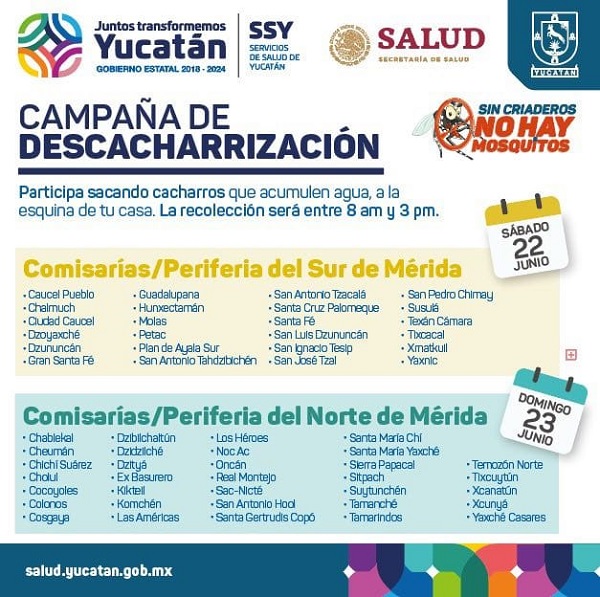La campaña de descacharrización continuará el sábado 22 de junio, abarcando las comisarías y zonas habitacionales de la periferia de Mérida, llegando a Caucel Pueblo, Chalmuch, Ciudad Caucel, Dzoyaxché, Gran Santa Fé, Guadalupana Hunxectamán, Molas, Petac, Plan de Ayala Sur, San Antonio Tahdzibichén, San Antonio Tzacalá, Santa Cruz Palomeque, Santa Fe, San Luis Dzununcán, San Ignacio Tesip, San José Tzal, San Pedro Chimay, Susulá, Tixcacal, Xmatkuil, Yaxnic.