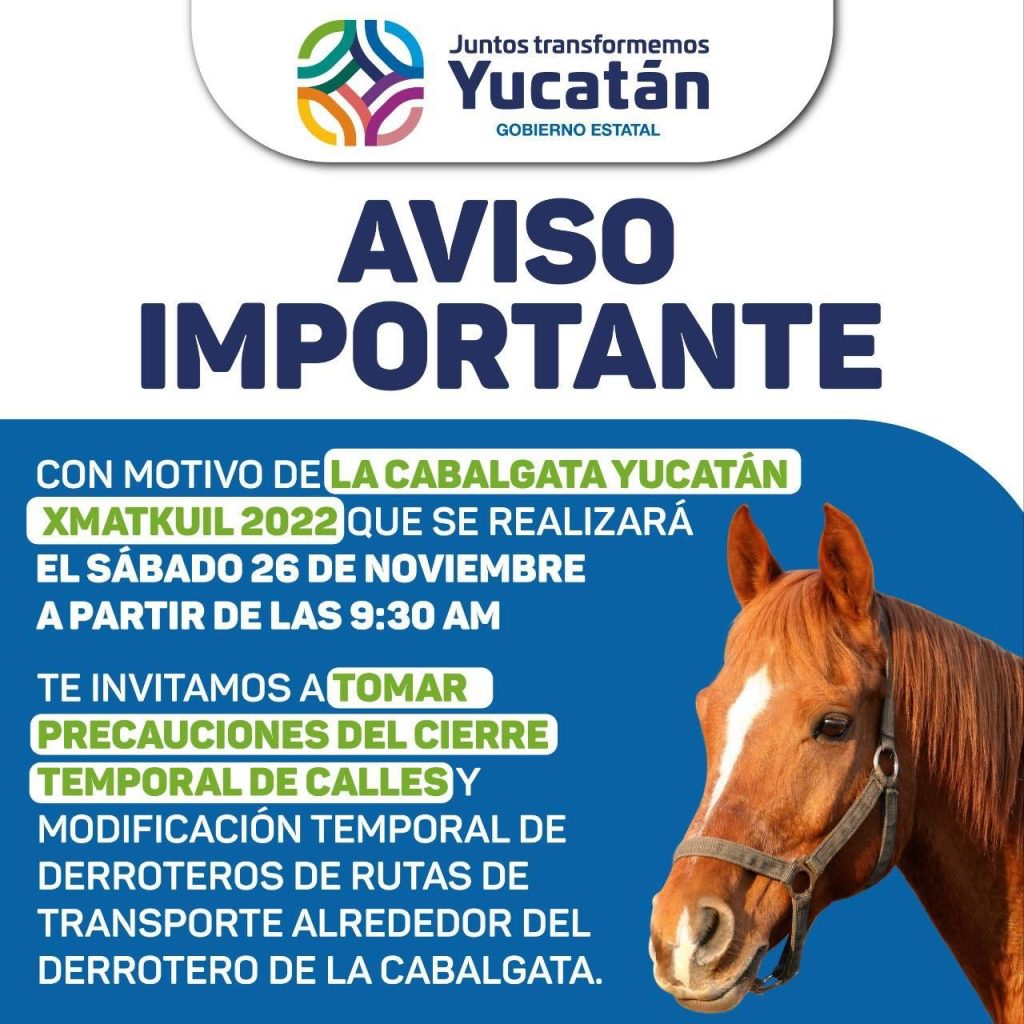 Mérida, Yucatán, 25 de noviembre de 2022.- El Gobierno del Estado, con motivo de la Cabalgata Yucatán Xmatkuil 2022, informa que mañana sábado algunas vialidades se cerrarán temporalmente a la circulación, principalmente en el oriente y sur de Mérida, por lo que algunas rutas de transporte que circulan en esas zonas modificarán sus derroteros, sin que ello signifique mayores afectaciones a los usuarios.