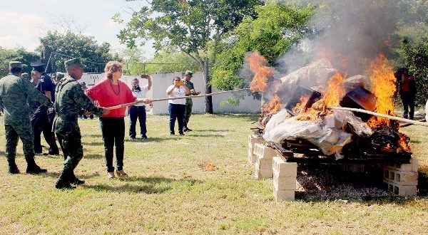 Junto a militares y representantes de los cuerpos de seguridad, agregó que la coordinación entre las autoridades responsables de este aseguramiento e incineración es trascendental para evitar que estas sustancias nocivas para la salud lleguen a la juventud y niñez yucateca.