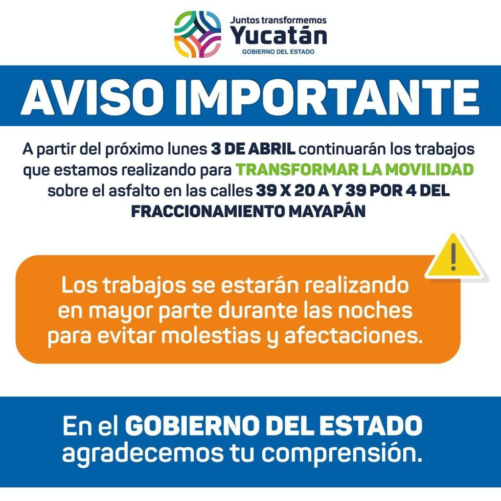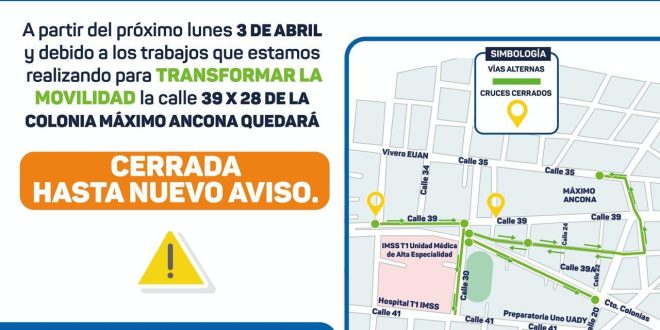 -El Gobierno estatal informó que a partir de las 10 de la noche del próximo lunes 3 de abril se restringirá el paso vehicular en las intersecciones de las calles 39 con 36 de la colonia Jesús Carranza y de la calle 39 por 28 de la colonia Máximo Ancona.
