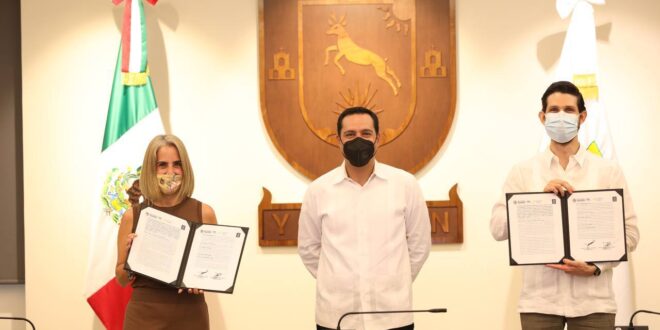 El Gobernador Mauricio Vila Dosal atestiguó la firma de un convenio de colaboración entre el director del Instituto Yucateco de Emprendedores (IYEM), Antonio González Blanco, y la directora General del referido organismo, Rocío Abud Mirabent, que derivará en acciones de capacitación en línea, asesorías grupales, networking y recompensas para motivar a los empresarios, todo dentro del mencionado esquema.