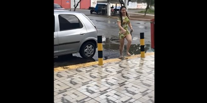 Un video se está volviendo viral en la red social X. El clip muestra a una joven vestida con un minivestido floreado, caminando por la calle luego de una lluvia, mientras esquivaba un charco para subir a la acera. Mientras la grababan, en el fondo del video se registra un accidente: un automóvil con las direccionales encendidas gira a la derecha e impacta contra un motociclista que circulaba a su lado.
