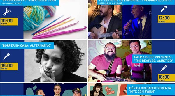 En su séptima semana de transmisiones, quienes siguen las redes sociales desde el Facebook de Mérida es Cultura podrán disfrutar 23 propuestas de música diversa,11 talleres, cuatro obras interdisciplinarias, cuatro de teatro, dos charlas, dos propuestas de arte del payaso, dos de literatura, así como una de arte circense y una de visuales.