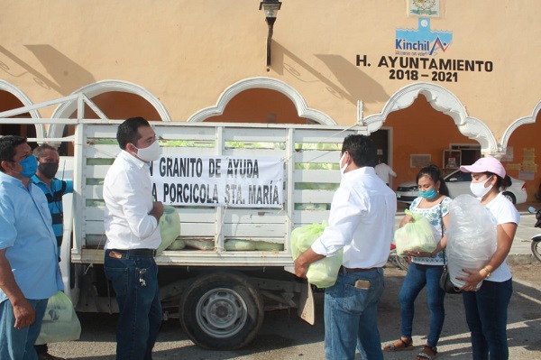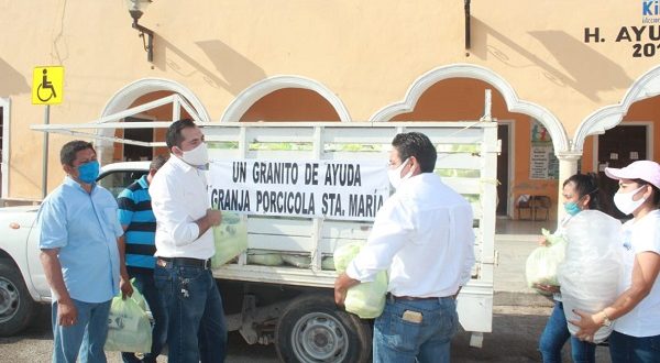 KINCHIL, Yuc., 28 de mayo 2020.- Este jueves, integrantes de la Granja Porcícola Santa María, hicieron entrega al edil kinchileño Valentín Pech Dzib, de 500 paquetes alimentarios para mismo número de familias de escasos recursos. La entrega fue encabezado por el C.P David Alvarado González, gerente de dicha granja.
