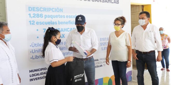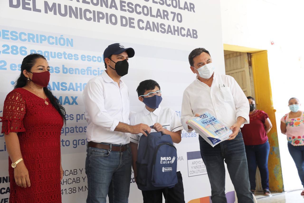 Sobre este tema, el titular de la Secretaría de Educación del estado (Segey), Liborio Vidal Aguilar, explicó que en Cansahcab se entregaron 1,286 paquetes de útiles escolares del programa “Impulso Escolar” así como de uniformes y libros de texto para beneficiar a las alumnas y alumnos de 12 escuelas, de las cuales, 7 se encuentran en esta localidad y las 5 restantes en el municipio de Temax.