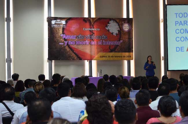 El origen, la identificación y las consecuencias de los diversos tipos de violencia fueron expuestos en la conferencia “Amar sin violencia…y no morir en el intento” que impartió esta tarde la Dra. Rocío Quintal López, especialista en el tema, en el recinto del Tribunal Superior de Justicia del Estado, como parte de las actividades de inclusión y perspectiva de género que se fomentan y difunden en la institución.