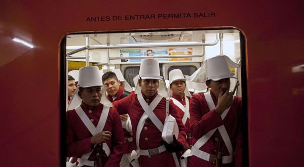 Members of the Mexican army wearing historical uniforms ride in the subway on their way to downtown Mexico City, prior to the military parade of the Independence Day celebrations, Mexico City, Sunday Sept. 16, 2012. Mexico celebrates the 202nd anniversary of its 1810 independence uprising. (AP Photo/Alexandre Meneghini)