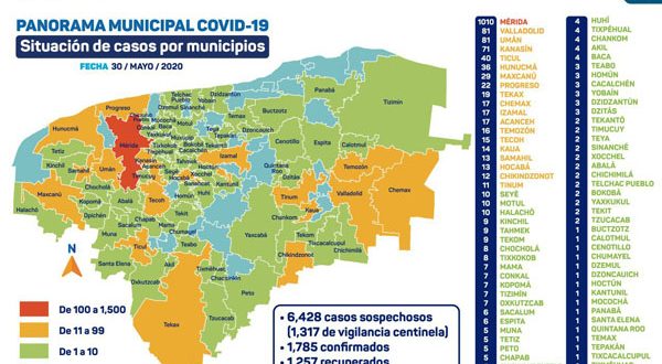 Mérida, Yucatán, 30 de mayo de 2020.- Hoy se detectaron 75 nuevos contagios de Coronavirus: 42 en Mérida, 8 en Progreso, 5 en Temozón y Ticul, 3 en Kanasín y Umán, 2 en Chicxulub Pueblo y Tekax, y 1 en Akil, Chacsinkín, Halachó, Hocabá y Hunucmá. En total, ya son 1,785 casos positivos, 14 de los cuales son de otro país u otro estado.