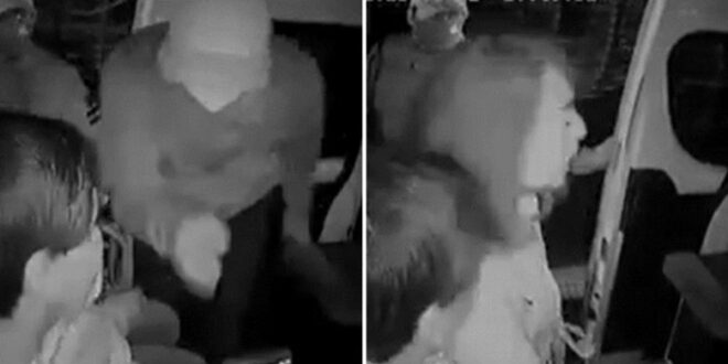 Cámaras de seguridad captaron el momento en el que tres sujetos le hacen la parada a una combi y la mujer que va en el asiento junto a la puerta se percata de las intenciones de los delincuentes , por lo que de inmediato esconde su teléfono celular debajo de la pierna.
