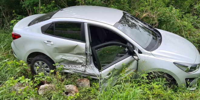 Tetiz, Yuc., a 08 de agosto.- Una pareja de turistas extranjeros que se dirigía a Sisal, se perdieron y les costó que se salieran cuando iban por Tetiz, y encima los impactaron para quedar montados en las rocas.